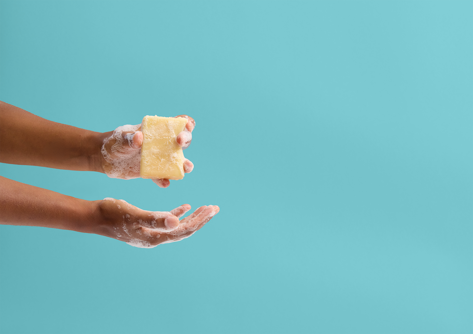 - Befeuchte die Seife und reibe sie sanft zwischen den Händen, bis ein cremiger Schaum entsteht.