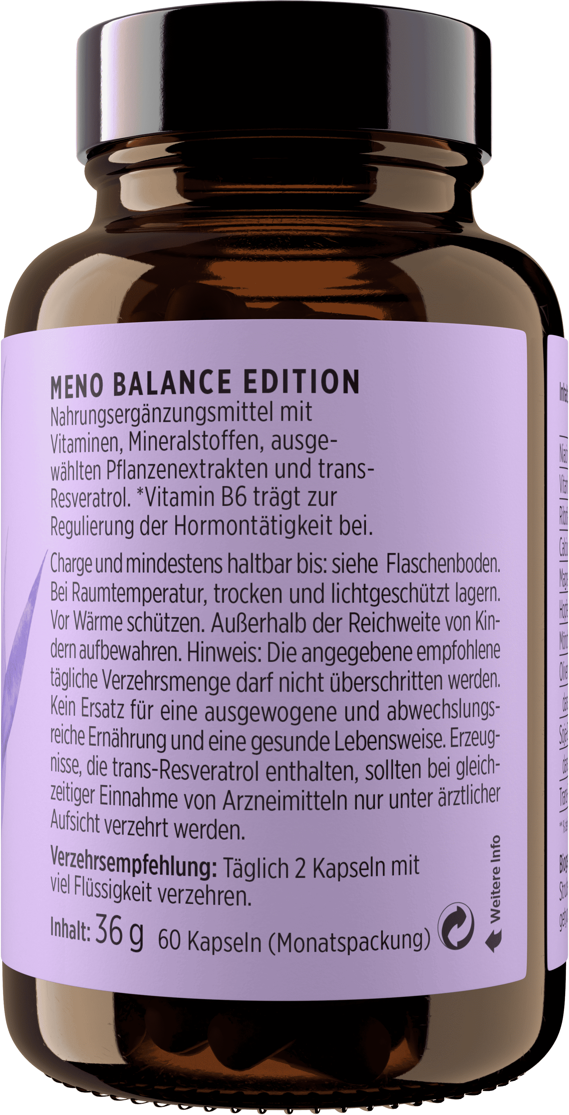 Die MENO BALANCE EDITION vereint eine sorgfältig abgestimmte Auswahl an Pflanzenextrakten wie Mönchspfeffer, Hopfen, Olivenblatt und Soja mit trans-Resveratrol. Ergänzt wird die Rezeptur durch die Vitamine B2, B3 und B6 sowie die Mineralstoffe Calcium und Magnesium.