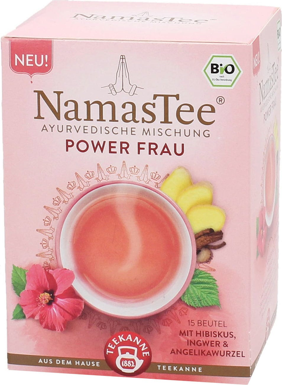 Dieser NamasTee® unterstützt Powerfrauen und alle, die etwas Power benötigen! Die leichte Säure der Hibiskusblüte, feurig-fruchtiger Ingwer und die seit jeher sehr geschätzte Angelikawurzel ergeben als Trio einen erfrischend-fruchtigen Aufguss. Wie alle Teekompositionen aus dem Hause Teekanne stecken auch in dieser Rezeptur nur die erlesensten Zutaten - bei der Linie NamasTee® sogar in zuverlässiger Bio-Qualität.