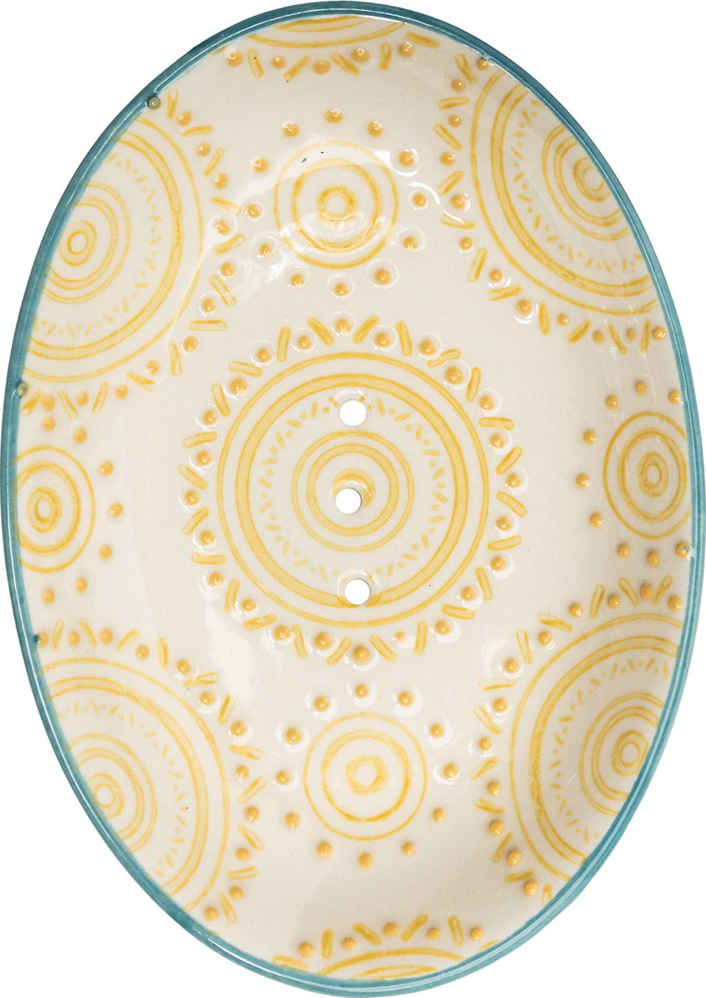 Die ovale Seifenschale aus Steinzeug wurde von Hand gestempelt und besitzt Löcher für den Wasserablauf. So kann deine Seife nach Gebrauch gut trocknen.