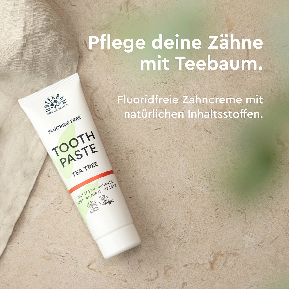 Die Zahnpasta von URTEKRAM setzt die Kraft der Natur ein, um rundum effektives Zähneputzen gewährleisten zu können. Die in der Zahnpasta enthaltene Kreide ist naturbelassen und wird lediglich fein vermahlen. Ihre natürliche, hellgraue Färbung verleiht auch der Zahnpasta ihre Farbe. Dank Teebaumöl, Myrrhe und Aloe Vera, werden Zähne und Zahnfleisch optimal gereinigt sowie gepflegt, während sie für frischen Atem sorgen.