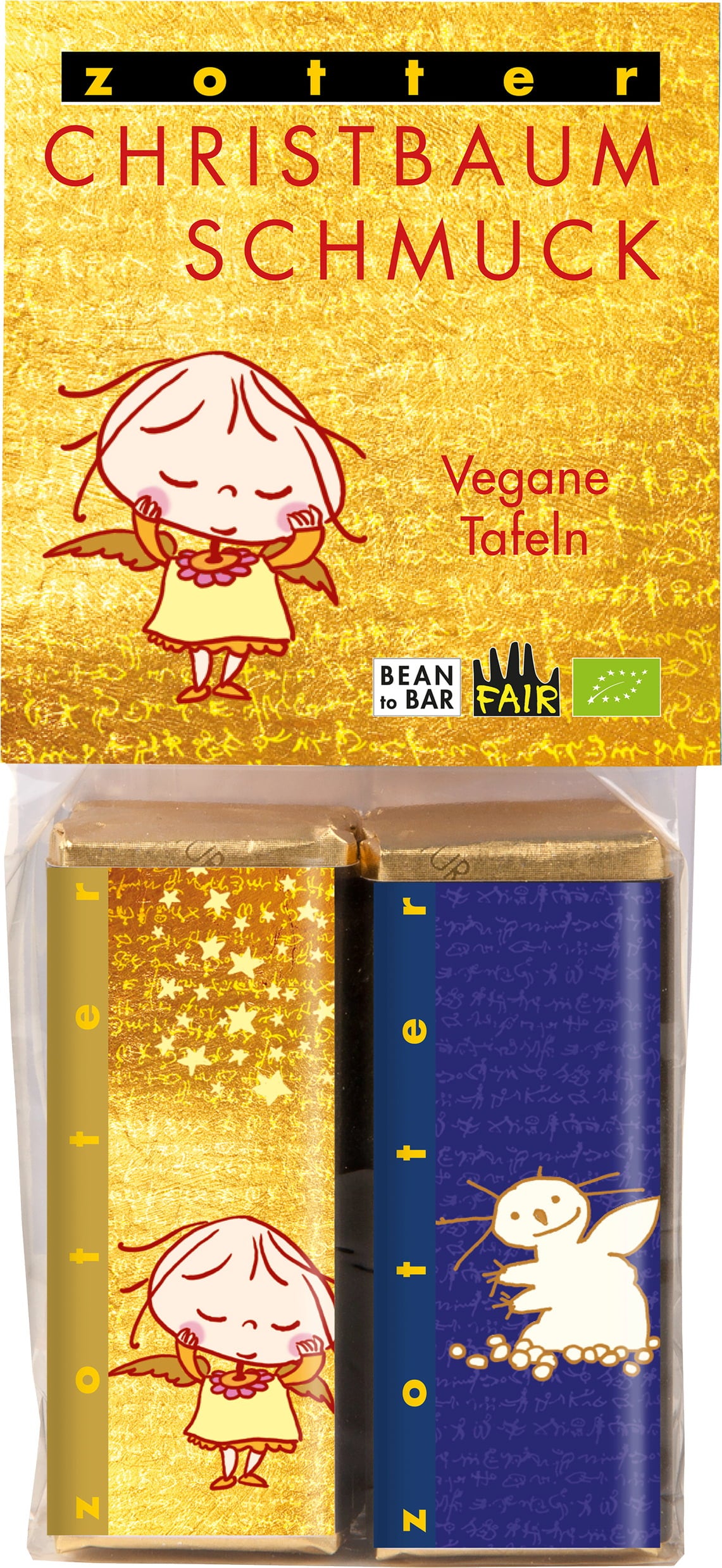 10 vegane Christbaumanhänger im Weihnachtsdesign mit feinen veganen Schokoladen zum Vernaschen. Fix und fertig zum Dekorieren mit Goldbändern verpackt.